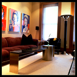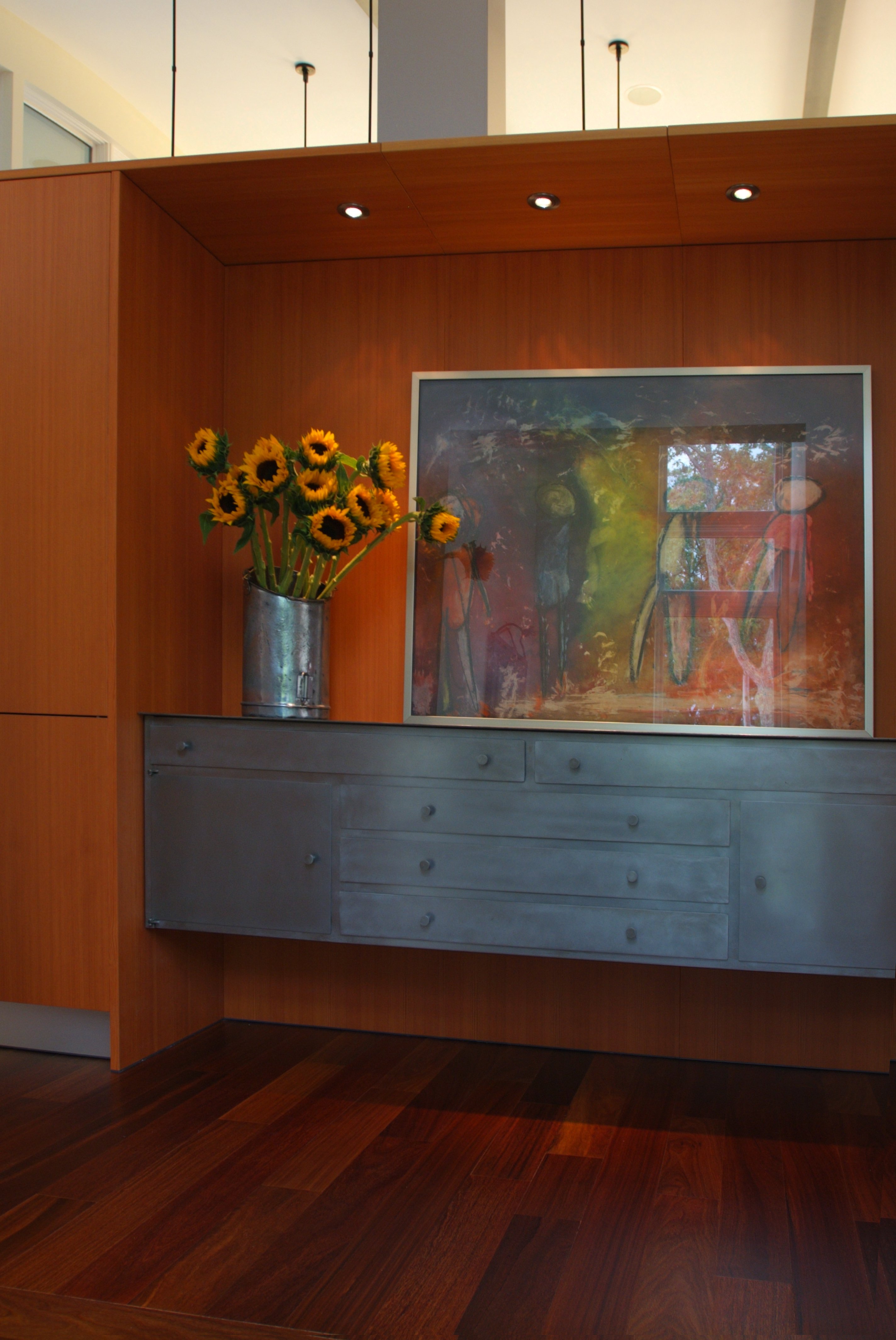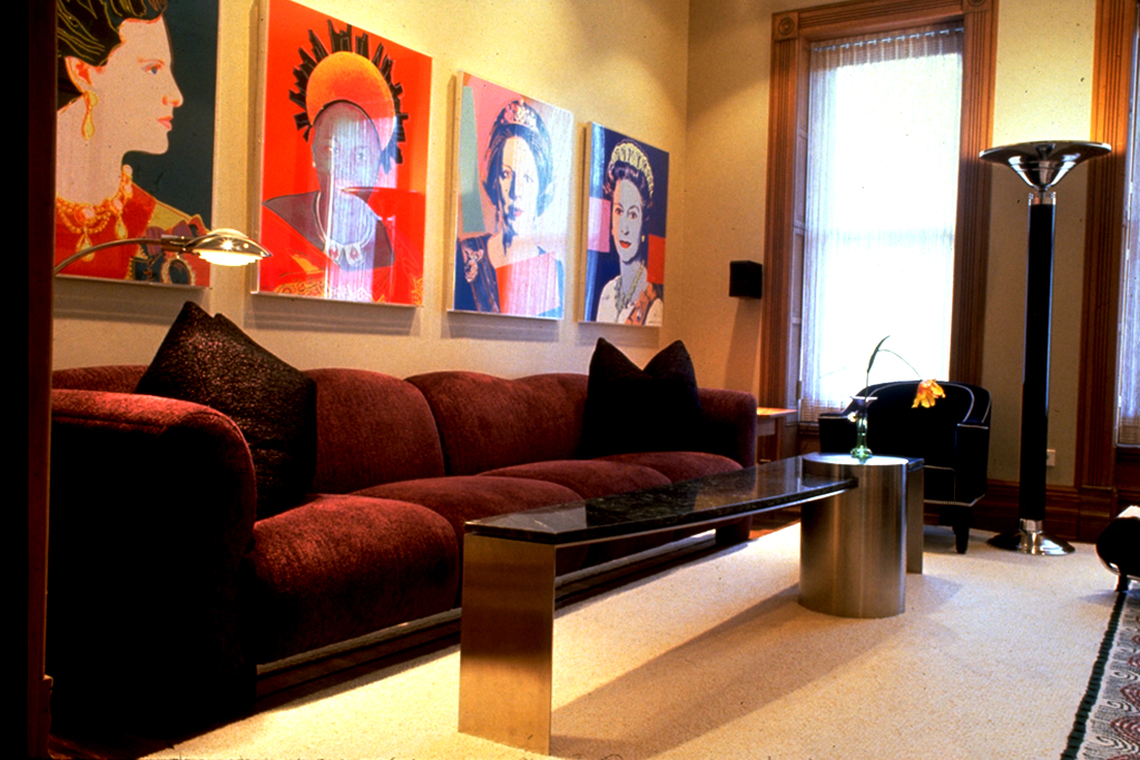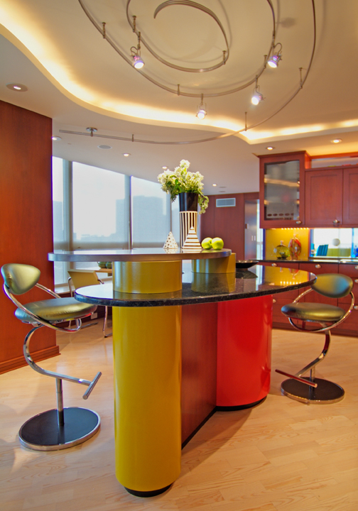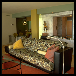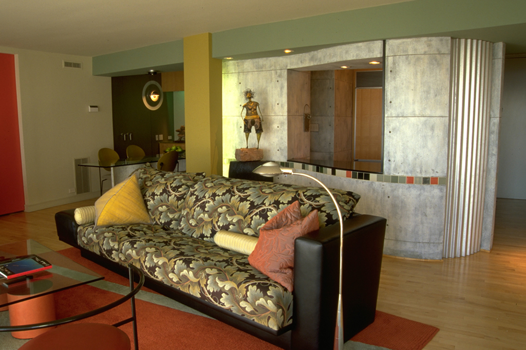 To up the architectural presence of an interior space, I have designed ceiling coves, wall niches, columns, custom trims and surface treatments. Altering the size or alignment of a doorway, or detailing the often-forgotten floor and ceiling planes are among the many possibilities that I consider to customize the interior architecture. Favorite techniques for making spaces more active and interesting include the use of angles or curves in the layout, and furniture arrangement which does not wrap the walls. Color, texture and light are prime tools for altering a space and making it more compelling.